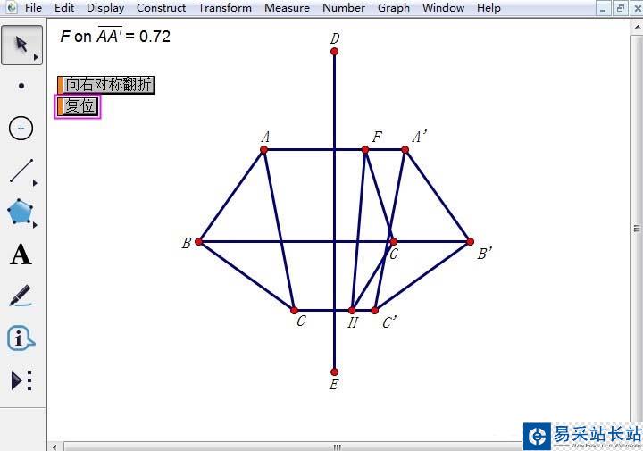 5、依次選中FA’,執行“編輯”——“操作類按鈕”—“移動”命令,這樣就得到一個按鈕,將按鈕標簽修改為:向右對稱翻折;同樣地,依次選中FA,執行“編輯”——“操作類按鈕”—“移動”命令,得到一個按鈕,將按鈕標簽修改為:復位,速度:高速。