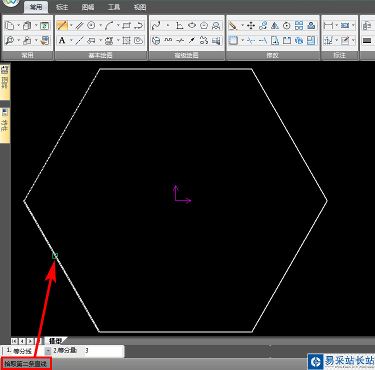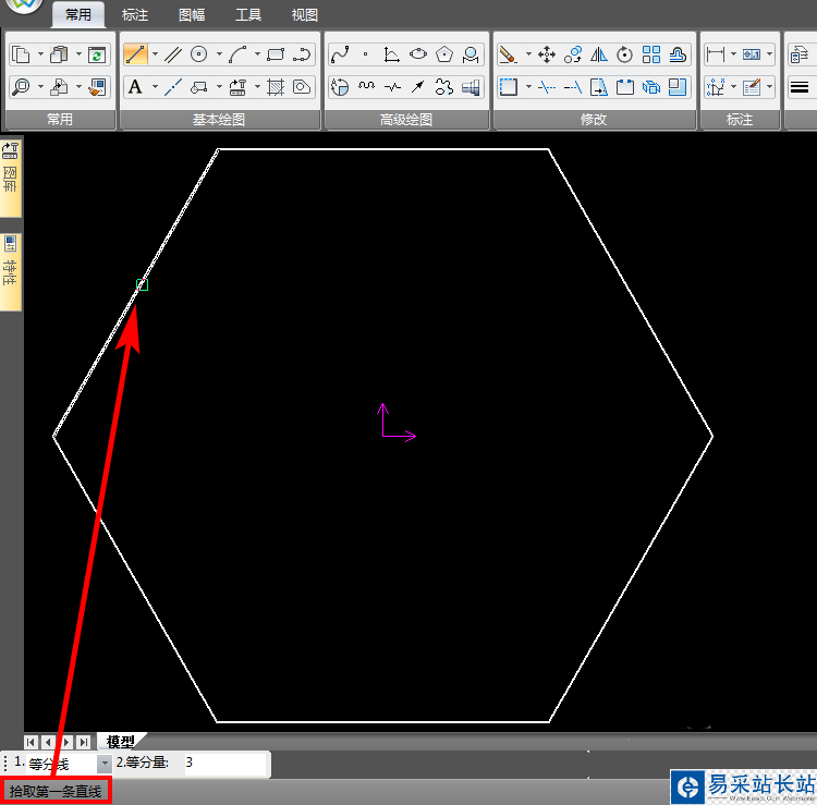4、先來演示相交兩條線的等分線,選擇六邊形的一條邊作為要拾取的第一條直線;