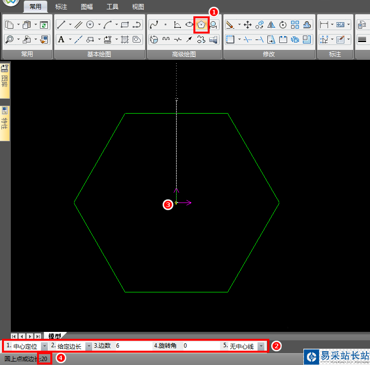 2、使用正多邊形命令,以坐標(biāo)原點(diǎn)為中心繪制一個邊長為20的正六邊形;
