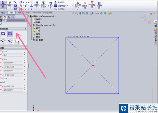 5、基準面選擇完以后我們就可以點擊上方菜單欄里的草圖繪制工具進行草圖繪制了,這里我們點擊四邊形圖標,此時在軟件的右側會彈出繪制提示,我們按照提示在繪圖區進行繪制就行了