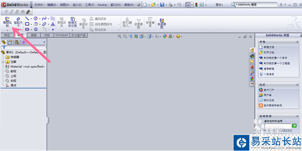 3、此時SolidWorks 2010軟件會切換到SolidWorks 軟件的草圖繪制頁面,在SolidWorks 2010草圖繪制頁面,我們點擊上方的菜單欄里的草圖繪制按鈕。