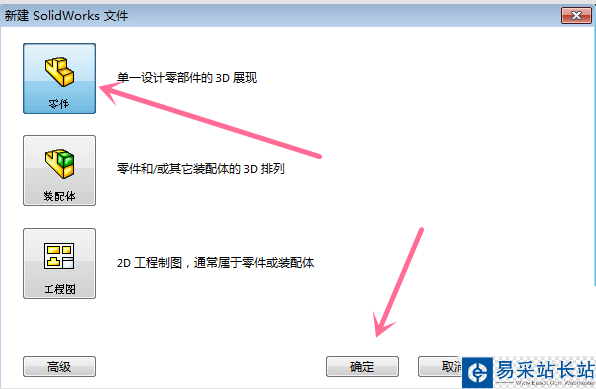 2、此時在SolidWorks 2010首頁會彈出SolidWorks 2010軟件新建文件選擇菜單頁面,在選擇菜單頁面里我們點擊選擇里面的第一選項零件選項,然后點擊下方的確定按鈕。