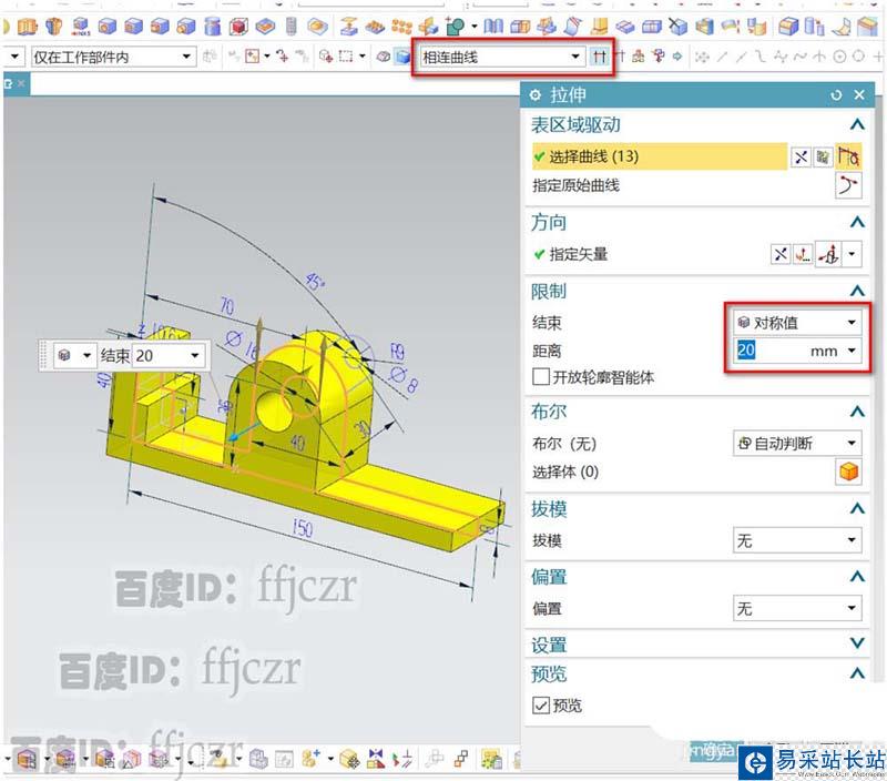 3、完成草圖,選用拉伸命令;將選擇模式改為相連曲線,并激活在相交處停止; 按圖選擇最大的輪廓線和中間的圓為這次拉伸的截面線,進行對稱拉伸,值為20.確定后完成。