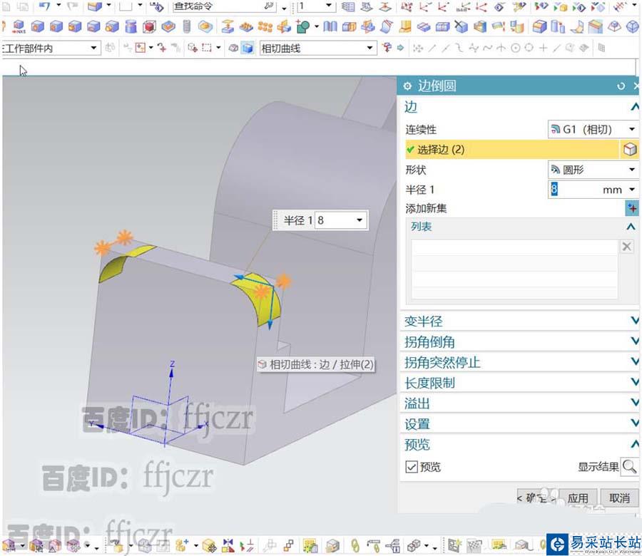 5、主體完成了,下面對細節(jié)的添加;選用三面倒圓命令,將圖中所示的端面倒成完全圓角。