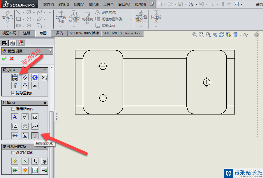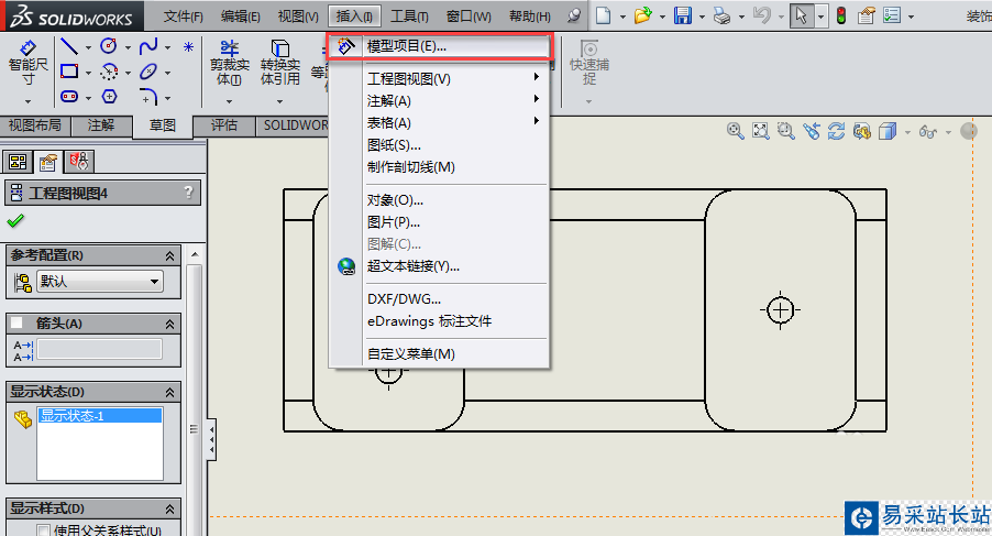 3、點(diǎn)擊選擇要插入裝飾螺紋線(xiàn)的視圖,然后在菜單欄中依次點(diǎn)擊“插入—>模型項(xiàng)目”,在左側(cè)的選項(xiàng)卡里“注解(A)”這一欄中將裝飾螺紋線(xiàn)選上,最后打鉤確認(rèn)即可。(插入模型項(xiàng)目時(shí),soliworks默認(rèn)選擇了“為工程圖標(biāo)注”,可以將其取消選擇,以免插入一堆無(wú)關(guān)的尺寸)