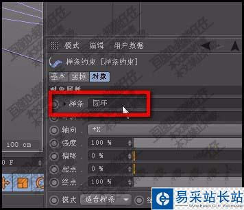 5、然后,在樣條約束的屬性這里,把圓形對象拉到屬性面板的樣條中。