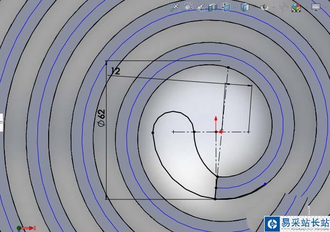 3、在渦狀線起點垂直面(右視圖)繪制蚊香截面的草圖。