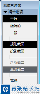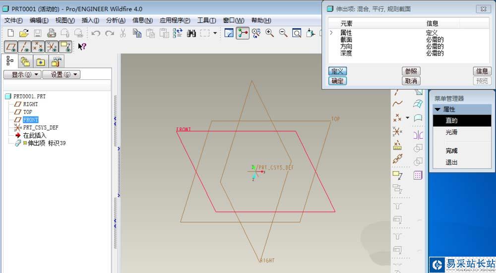 2、點(diǎn)擊“插入/混合/伸出項(xiàng)”,開始進(jìn)行以“混合”命令建模。在“菜單管理器”中,依次選擇“平行/規(guī)則截面/草繪截面”,然后點(diǎn)出確定。