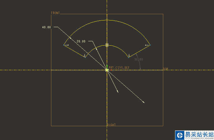 2、在繪圖區(qū)繪制兩個(gè)同心圓,并將兩圓修剪為夾角為120度的扇形