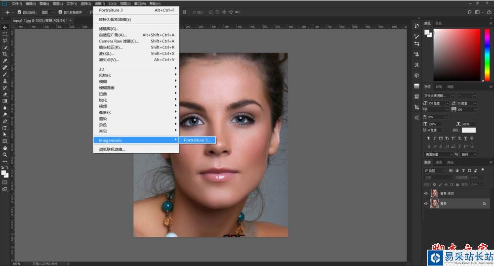 打開PS,并且打開一張人物圖片。在【濾鏡】→【Imagenomic】找到Portraiture 3,點(diǎn)擊就可以打開了。