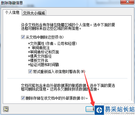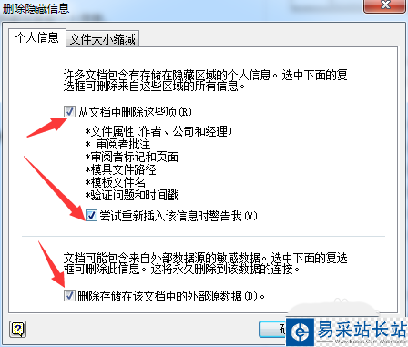 5、就會彈出了一個刪除隱藏信息的窗口的界面當中,勾選上各種的選項從文檔中刪除這些項的選項。
