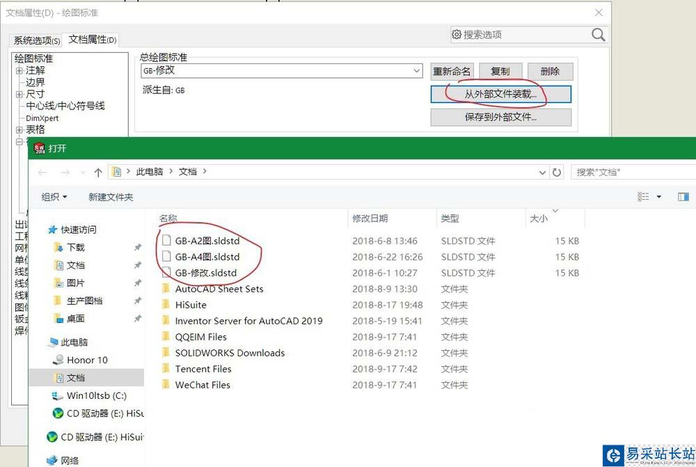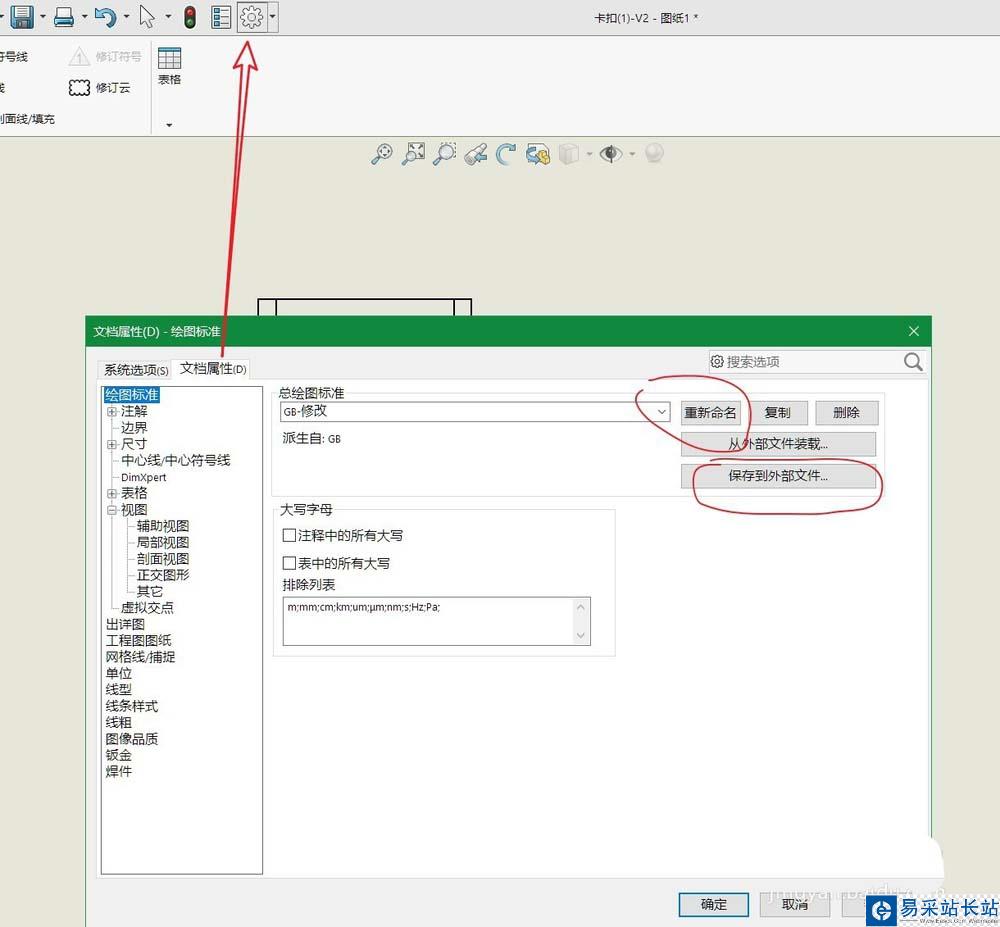 6、每次出工程圖都要改時,會很繁瑣,可以把改好的尺寸字體,注解樣式,視圖樣式。“保存到外部文件”,在選項 - 文檔屬性 - 繪圖標準,如圖。這樣要用時就可以“從外部文件裝載”而不用一個個去修改了。