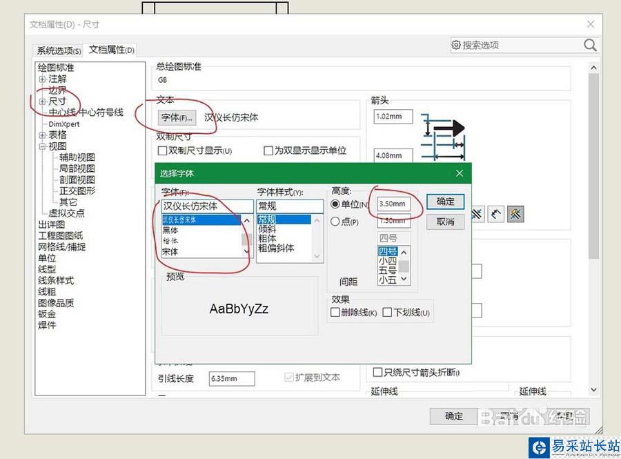 4、點開文檔屬性,再選擇尺寸,這時可以看到界面出現“文本”字體選項,點開。把字體改成喜歡的字體,把文字高度改大。改好后,點擊確定,再點擊確定。