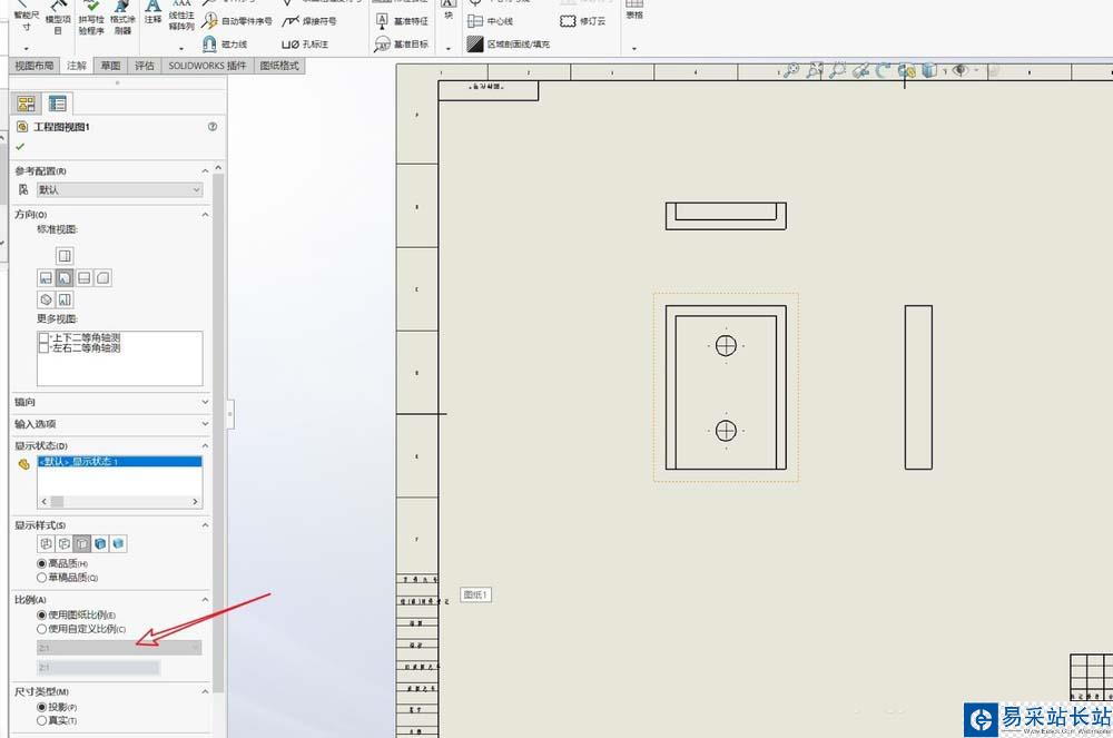 1、先打開一個3D圖,并轉成工程圖。如圖,轉成的工程圖比例為2:1,也就是說,圖紙實際比例是放大2倍的