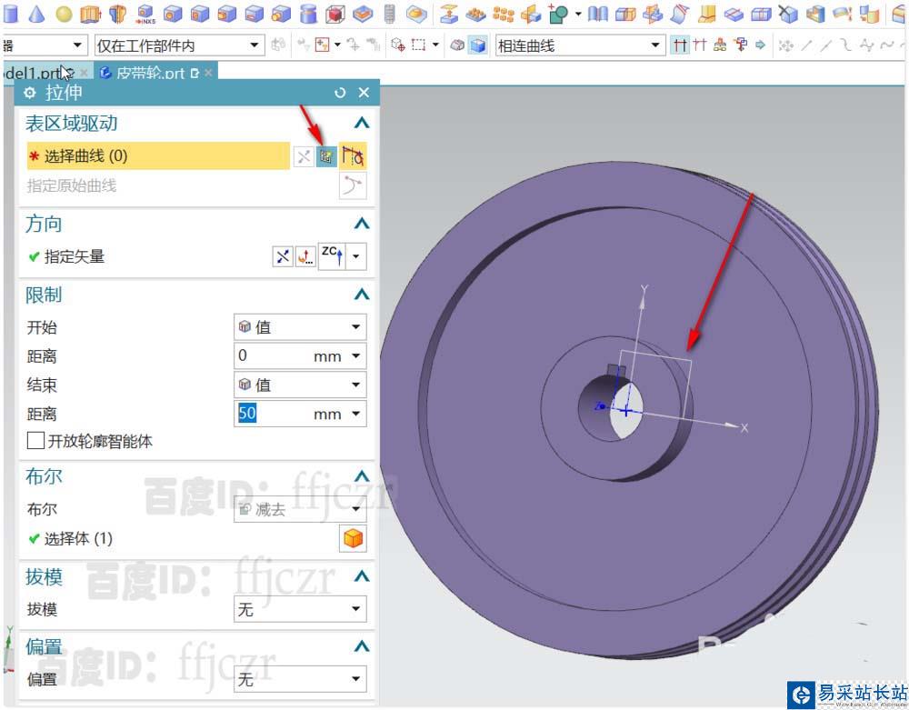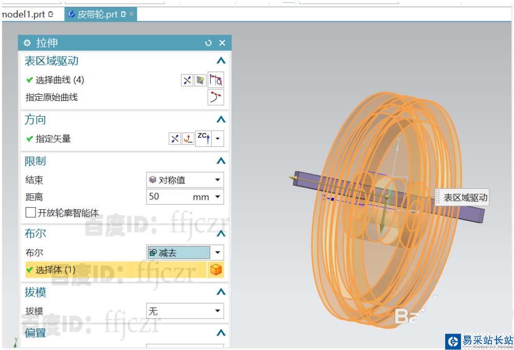 6、回到拉伸對話框,矢量方向為Z軸,拉伸方式為對稱拉伸,值為50(只要長超出皮帶輪的厚度即可)。布爾選項用減去。主體得到皮帶輪中開孔的效果。