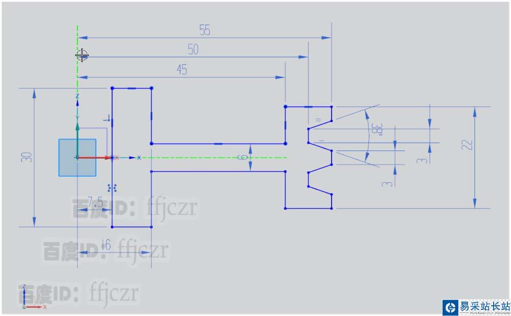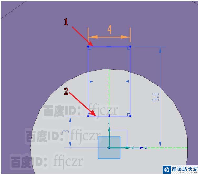 3、為皮帶輪創建鍵槽。選用拉伸命令,以XY面為草繪平面。在草繪模式中,在Y軸上繪制一個與Y軸對稱的矩形,矩形的長為4,矩形的長邊1距離X軸9.6,長邊2距離X軸3.