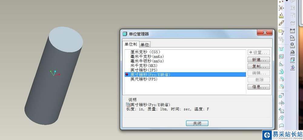6、可以看到默認的單位是---英寸磅秒---(即零件的長度單位為英寸,重量單位為磅,時間單位為秒)