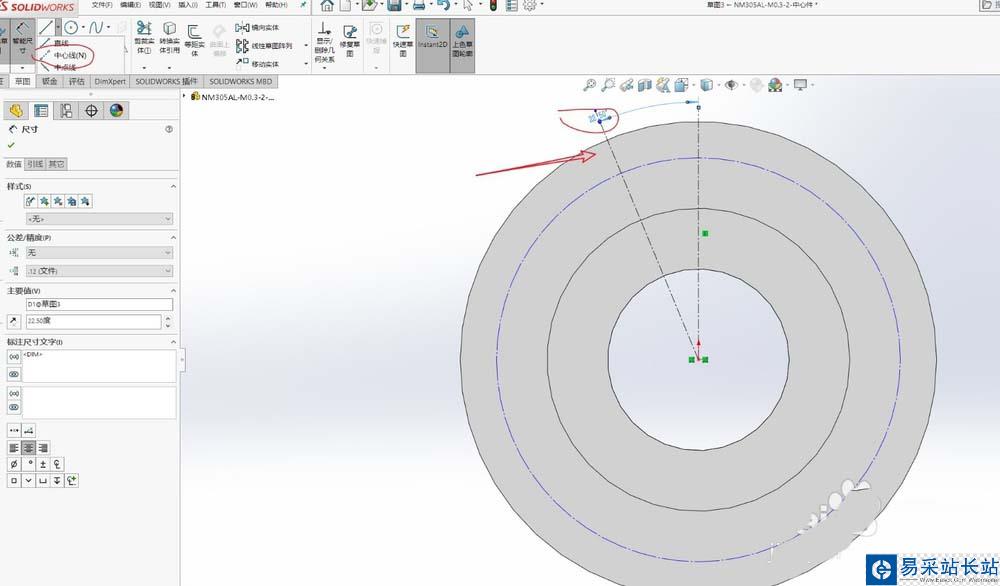 3、用中心線畫一個22.5度的夾角,凸出圖的線剪掉,畫好后選擇退出草圖,如圖