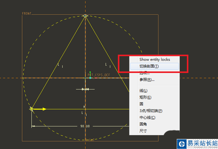 9、如下圖所示,在草繪區(qū)域空白處長按鼠標(biāo)右鍵至出現(xiàn)下圖中的下拉菜單為止,(注意,是長按,不能點(diǎn)擊一下就松開,那樣沒用)然后在彈出的下拉菜單中點(diǎn)擊“切換剖面”。這一步至關(guān)重要。