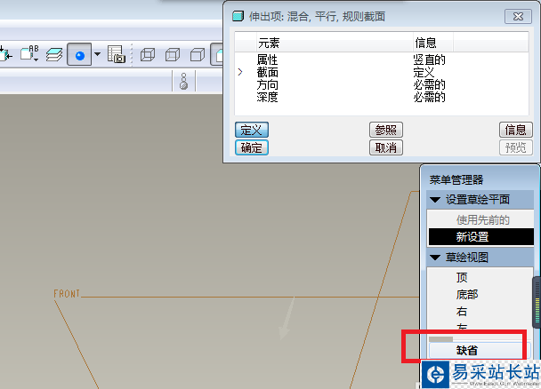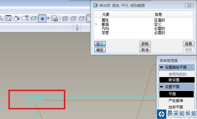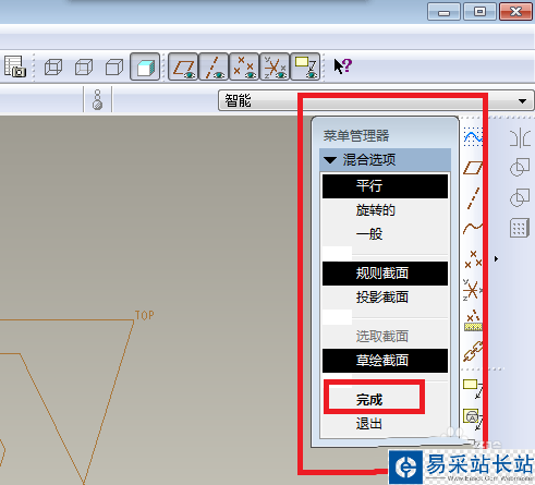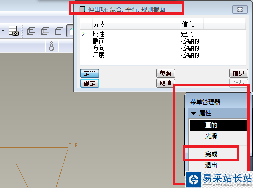 4、如下圖所示,出現(xiàn)了一個(gè)“伸出項(xiàng):混合,平行,規(guī)則截面”對(duì)話框,然后菜單管理器有變化了,可以點(diǎn)擊其中的“完成”。
