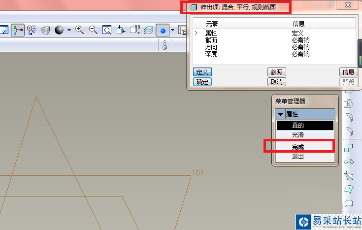 3、如下圖所示,一個“伸出項”的對話框出現了,菜單管理器中的屬性默認是“直的”,所以點擊“完成”。