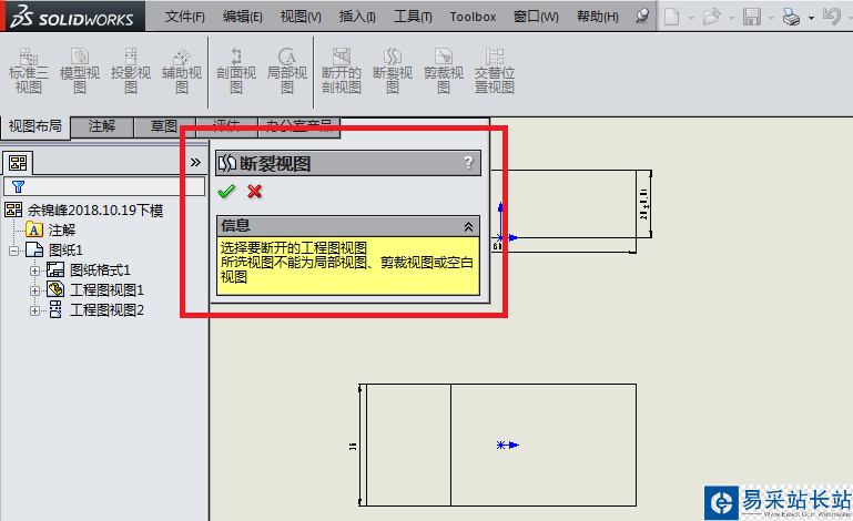 3、如下圖所示,出現“斷裂視圖”對話框,可以看到信息提示:選擇要斷開的工程圖視圖。