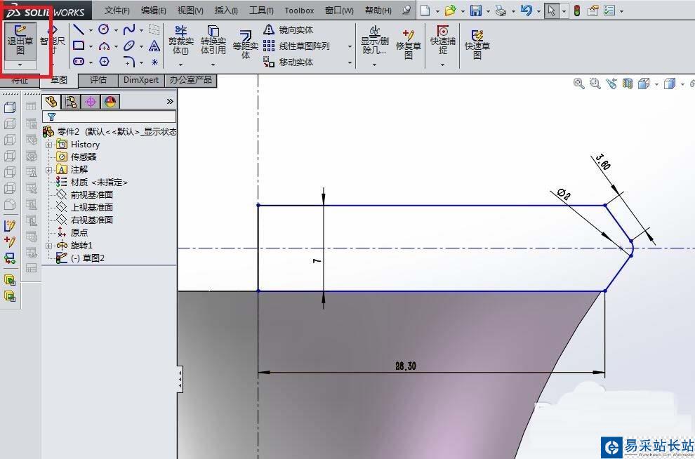 6、如下圖所示,嚴(yán)格按照?qǐng)D中尺寸畫草圖,畫好之后“退出草圖”。