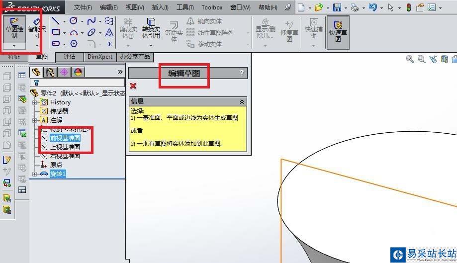 5、如下圖所示,點(diǎn)擊工具欄中的“草圖繪制”,出現(xiàn)“編輯草圖”對(duì)話框,在設(shè)計(jì)樹中選擇“前視基準(zhǔn)面”為草圖平面。