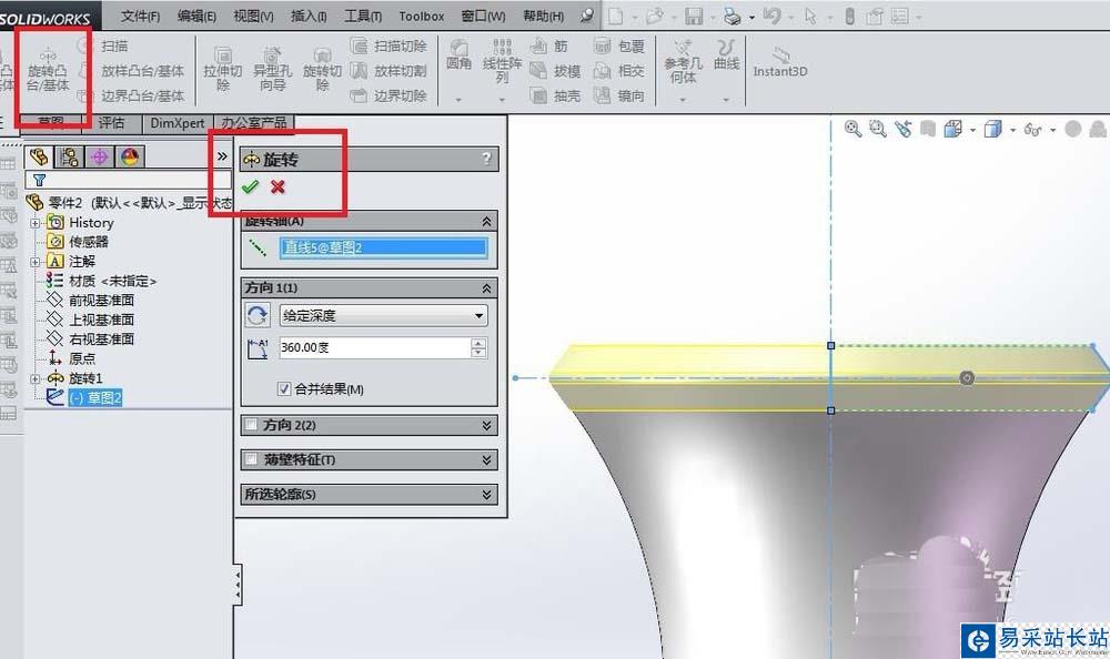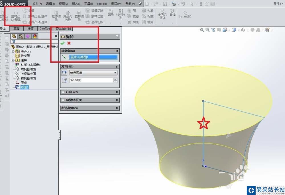 4、如下圖所示,選擇剛剛畫的草圖,點(diǎn)擊工具欄中的“旋轉(zhuǎn)凸臺(tái)/基體”圖標(biāo),出現(xiàn)“旋轉(zhuǎn)”對(duì)話框,旋轉(zhuǎn)軸一欄選擇紅色五角星所在的直線,看預(yù)覽效果,可以打√了。