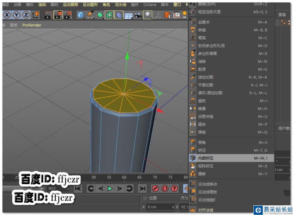 3、在面模式下,選中圓柱體上端面(如圖所示),選用內部擠壓命令,偏移值為5。
