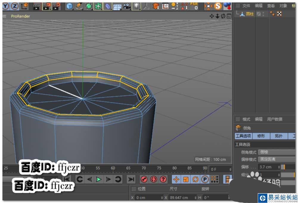 5、在邊模式下選中圓柱上端面向下擠壓后得到的邊線;選用倒角命令,對選中的兩條邊進行倒圓角,偏移值為3.5,細分為3.