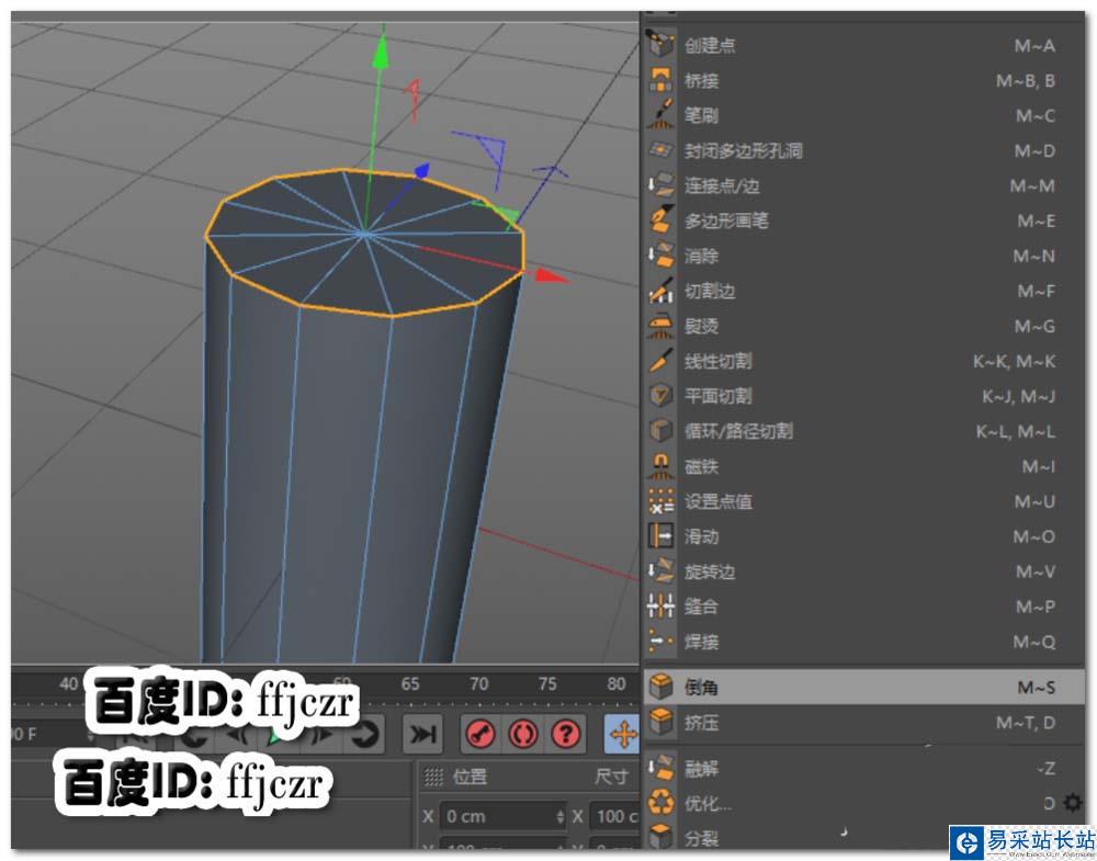 2、將圓柱轉為可編輯多邊形,在點模式下將模型的所有點優化一下。在邊模式下選中圓柱上下端面的邊線;選用倒角命令,對選中的兩條邊進行倒圓角,偏移值為3.5,細分為3.