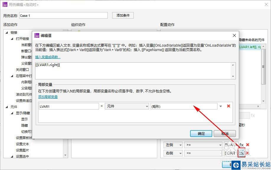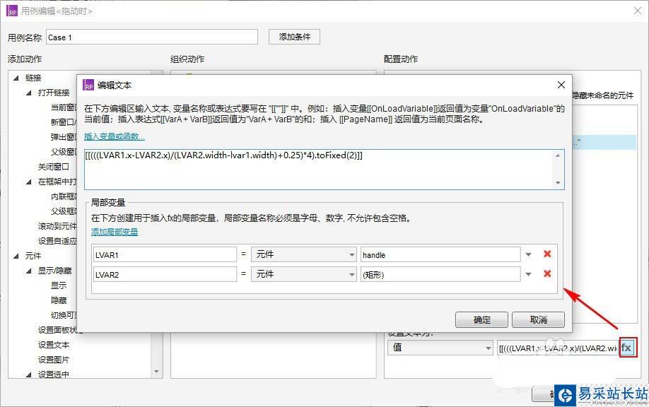 其中,“動態面板:handle”為局部變量LVAR1,“元件:矩形”為局部變量LVAR2;所以,“文本標簽:ratio”的值為“[[(((LVAR1.x-LVAR2.x)/(LVAR2.width-lvar1.width)+0.25)*4).toFixed(2)]]”