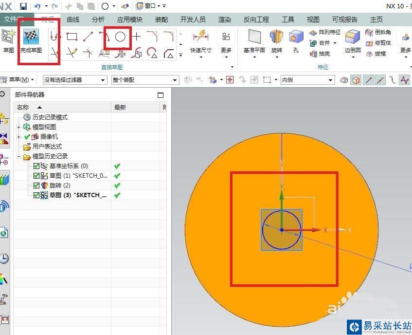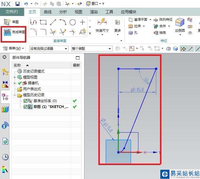 3、如下圖所示,進入到草圖狀態,點擊工具欄中的“直線”圖標,畫直線,點擊工具欄中的“圓”圖標,畫圓,點擊工具欄中的“直線”圖標,畫切線,“完成草圖”并退出。最終草圖效果如下。