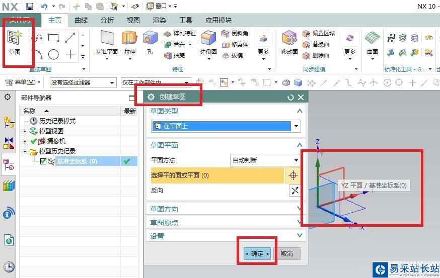 2、如下圖所示,點擊工具欄中的“草圖”,隨之出現一個“創建草圖”對話框,然后在基準面坐標系中選擇“YZ平面”為草圖平面,最后點擊“確定”。