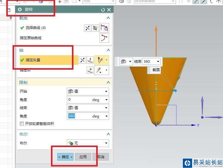 5、如下圖所示,出現“旋轉”對話框,選擇曲線為剛剛畫的草圖,軸選擇那條豎直的線段,最后“確定”完成旋轉操作。