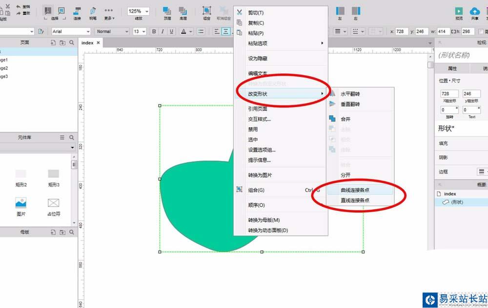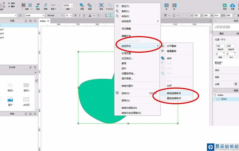 8、如果想要圖形的所有尖角都變成圓角,那么只需要對準(zhǔn)圖形點(diǎn)擊右鍵,在彈出的菜單中選擇“改變形狀”,再選擇“曲線連接各點(diǎn)”即可獲得一個圓潤的圖形。