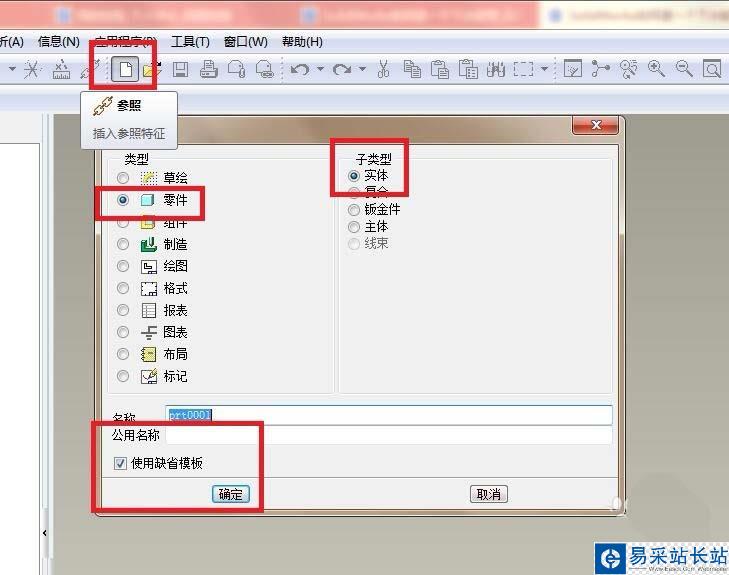 1、如下圖所示,打開Pro/e5.0軟件,新建一個空白是實體零件文件,為了省事,最好“使用缺省模板”。