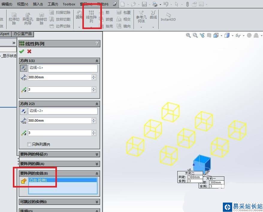 5、如下圖所示,進(jìn)行線性陣列的操作。具體:點(diǎn)擊工具欄中的“線性陣列“圖標(biāo),在“線性陣列“對(duì)話框中設(shè)置要陣列的實(shí)體為剛剛創(chuàng)建的正方體,分別設(shè)置兩個(gè)方向,間距300,數(shù)量3。點(diǎn)擊對(duì)話框左上角的√,完成線性陣列操作,到這里,木托盤中間的木墊塊才算是造好了。