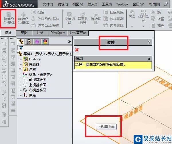 2、如下圖所示,創(chuàng)建木托盤中間的木塊。具體:點(diǎn)擊工具欄中的“拉伸凸臺(tái)/基體”圖標(biāo),根據(jù)彈出的“拉伸”對(duì)話框中的提示,在出現(xiàn)的三個(gè)基準(zhǔn)面中選擇“上視基準(zhǔn)面”。