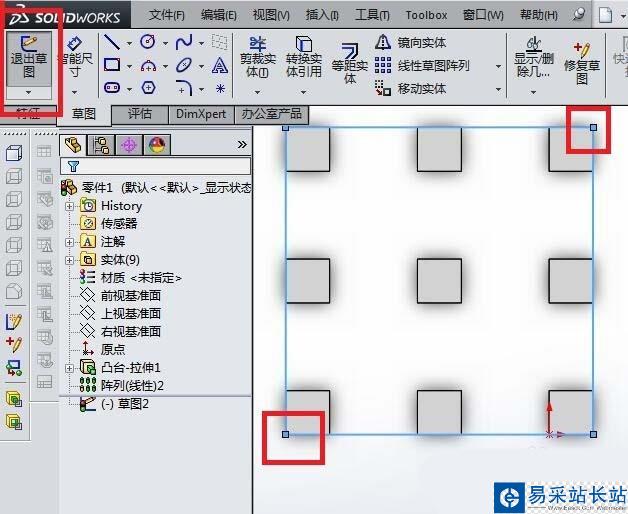 3、如下圖所示,畫木塊拉伸截面。具體:點(diǎn)擊工具欄中的“矩形”圖標(biāo),以草圖區(qū)域以坐標(biāo)原點(diǎn)為起點(diǎn)畫一個(gè)矩形,點(diǎn)擊工具欄中的“智能尺寸”,標(biāo)注尺寸為100x100的正方形,點(diǎn)擊工具欄中的“退出草圖“。