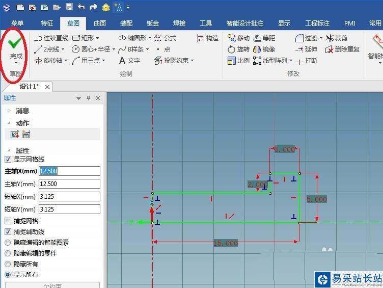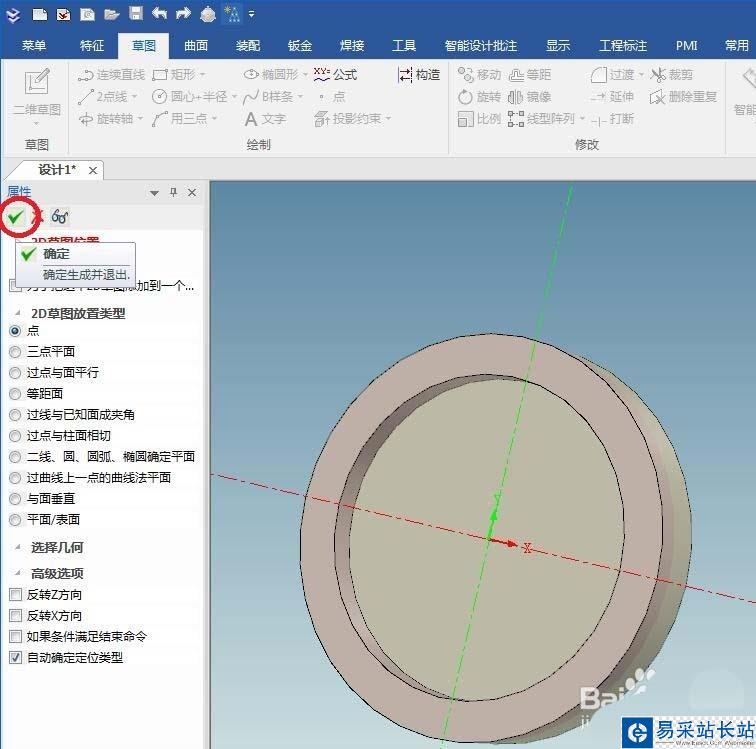 9、如下圖所示,進入到草圖環境,在X軸上畫一個小圓,然后標注尺寸,最后“完成”。