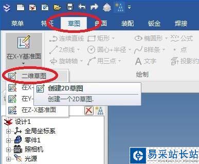 6、如下圖所示,點擊標題欄中的“草圖”,點擊“二維草圖”,創建2D草圖。