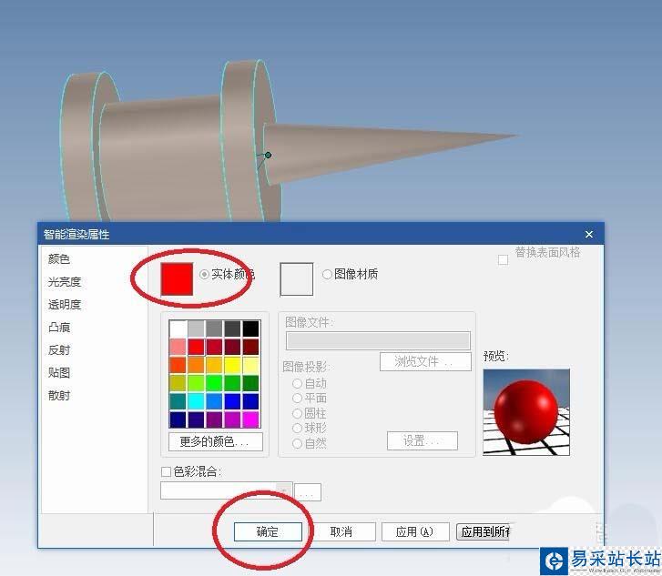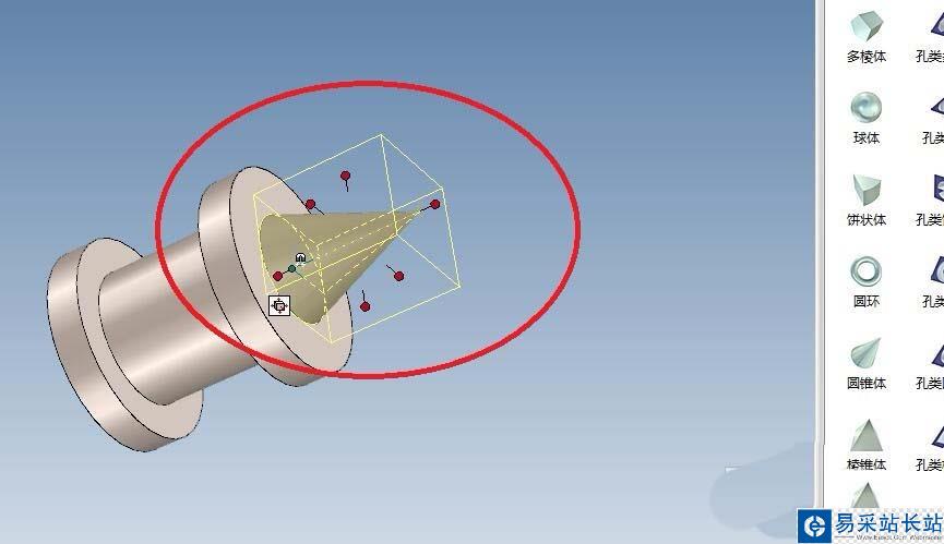 6、如下圖所示,為了節省時間,我們直接從設計元素庫中拖一個圓錐體過來,記住,放置的位置是面的中點,然后軟件會有下圖中的提示:調整實體尺寸對話框,我們只管點擊“確定”就可以了。