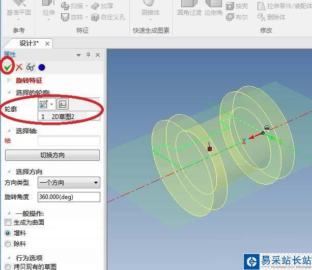 5、如下圖所示,屬性欄中出現了“旋轉特征”,輪廓一欄我們選擇剛剛畫的草圖就行了,看著預覽效果,我們只管打√。