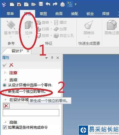 2、如下圖所示,點擊工具欄中的“拉伸”,屬性欄中的選項,我們點擊“新生成一個獨立的零件”。