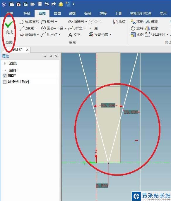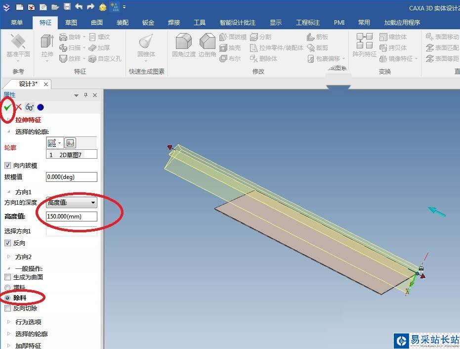 9、如下圖所示,退出草圖之后,來到屬性欄,看著預覽的效果,調整方向,設置高度值,一定要超過之前的實體,關鍵的關鍵是要點擊“除料”,最后才可以點擊“√”。