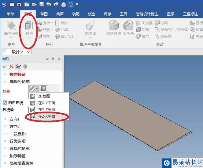 7、如下圖所示,屬性欄中的“輪廓”后面的草圖圖標,我們點擊“在Z-X平面”。