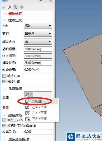 10、如下圖所示,退出草圖之后,在屬性欄中設置螺紋特征的參數:材料改成“刪除”,起始螺距:輸入2,其余可以采用默認,點擊“√”完成螺紋特征的創建。