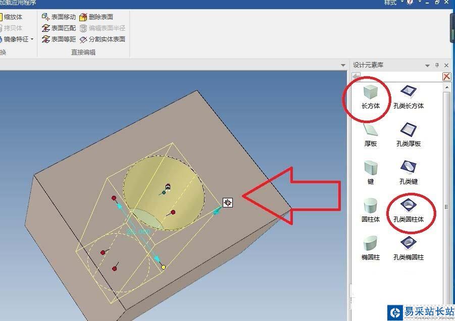 2、如下圖所示,為了節省時間,直接從設計元素庫中拖一個長方體和一個孔類圓柱體,然后手動修改一下孔的尺寸。